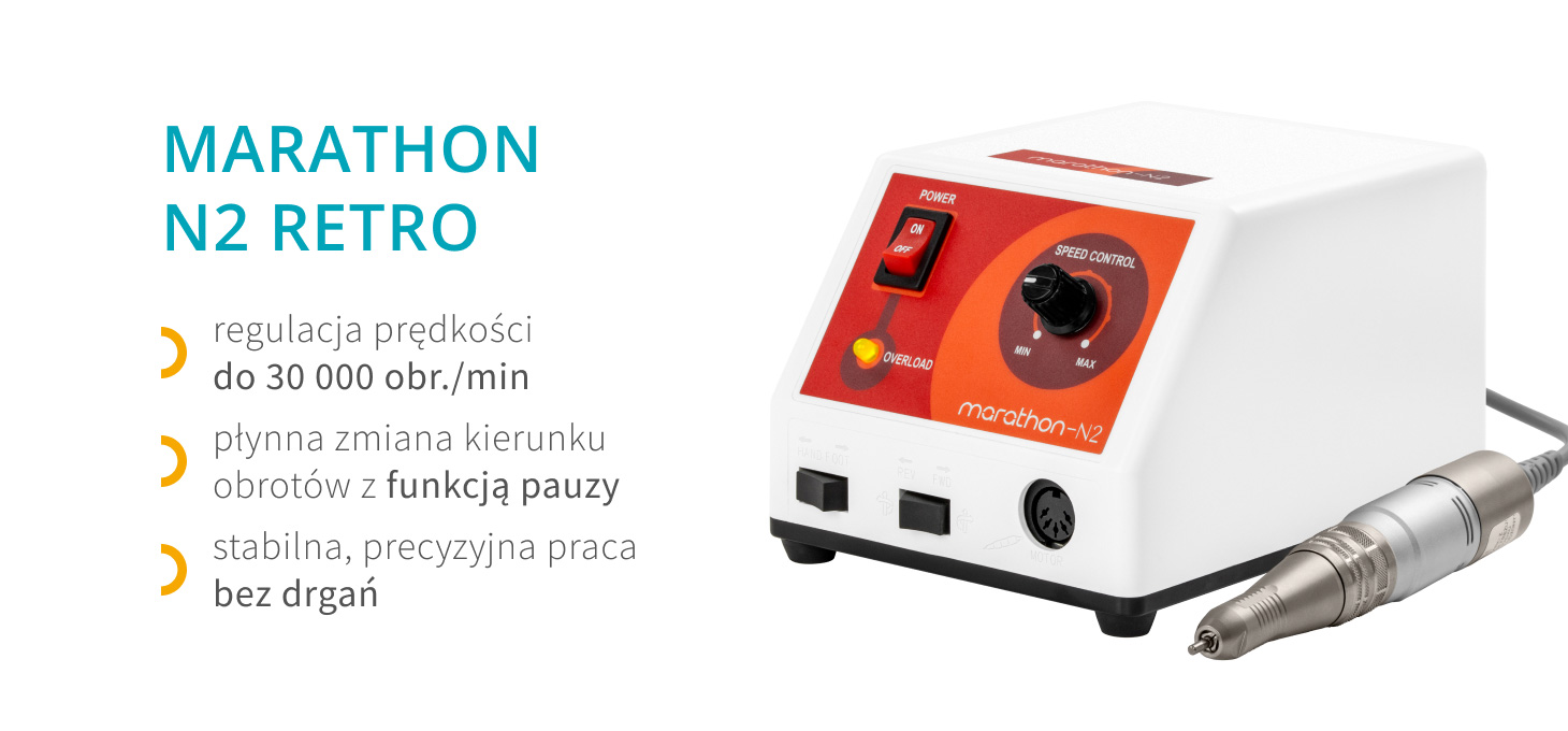 Frezarka Saeyang Marathon N2 Retro to funkcjonalne urządzenie umożliwiające precyzyjne opracowywanie paznokci i skórek oraz ich właściwe przygotowanie do kolejnych etapów zabiegu. Urządzenie znacząco usprawnia usuwanie pozostałości wcześniejszych stylizacji. Odpowiednie wyważenie głowicy, kompaktowe wymiary oraz dopracowane rozwiązania konstrukcyjne sprawiają, że frezarka sprawdza się zarówno w użytku profesjonalnym, jak i domowym.
