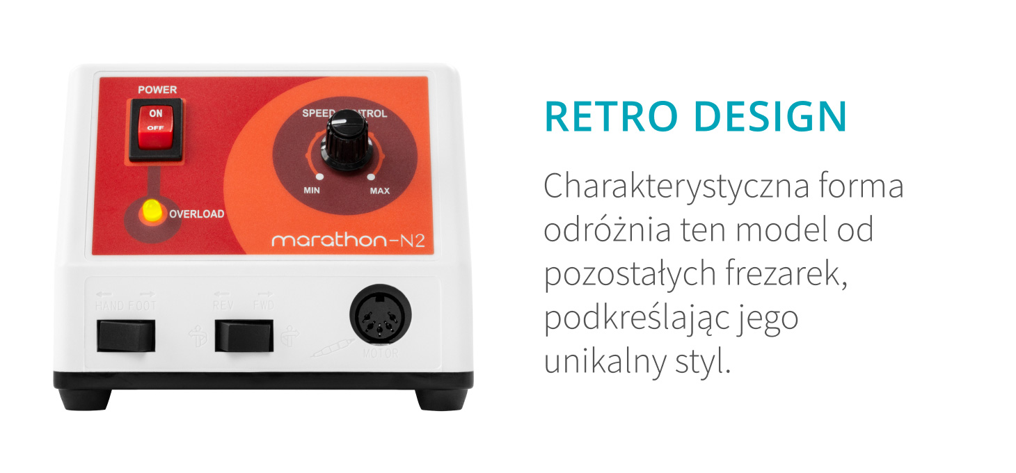 Frezarka Saeyang Marathon N2 Retro o niewielkich gabarytach łączy wysoką funkcjonalność z dopracowaną estetyką. Obudowa utrzymana w stylistyce retro, w odcieniach bieli i pomarańczu, nadaje urządzeniu charakterystyczny i przyciągający wzrok wygląd. Dodatkowo frezarka została wyposażona w gumowane stopki, które zapewniają stabilne ustawienie oraz chronią blat przed ewentualnymi uszkodzeniami. Frezarka doskonale sprawdza się w codziennej pracy, oferując komfort użytkowania przy każdym zabiegu manicure i pedicure.